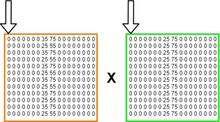 What happens next is that the model performs element wise multiplications using the filters that it's learnt, like I wrote before. That's very simple: if we put the two 2D arrays (also known as matrices) next to each other, we take the two elements at position (i,j) and multiply them. We do this for all the positions in the matrices, and add up the numbers.
