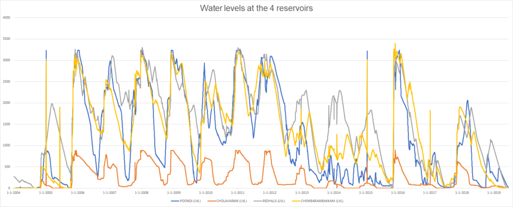The dataset provides daily rain and water levels for four reservoirs in the vicinity of Chennai: the Poondi Reservoir, the Cholavaram Reservoir, the Red Hills Reservoir and the Chembarambakkam Reservoir. They are some of the primary sources for water in Chennai, because the rivers are polluted with sewage (Wikipedia, 2013).