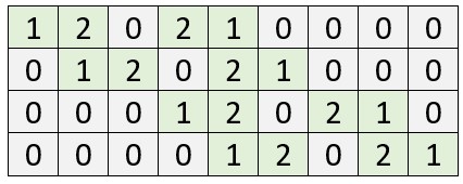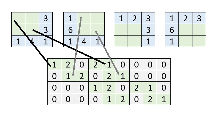One who looks closely, will notice that each row represents a position of the kernel on top of the image: in the first row, for example, the kernel is positioned at the top left of the image. The {1, 2, 0} at the first row of the convolution matrix therefore represents the effect of the convolution at the first row of the input image. The {2, 1, 0} represents the effect of the convolution at the second row of the input image. Since at this point in time, the convolution is not applied in either the 3rd column or the 3rd row, either the third column value of the first and second row and all the third row values are 0.