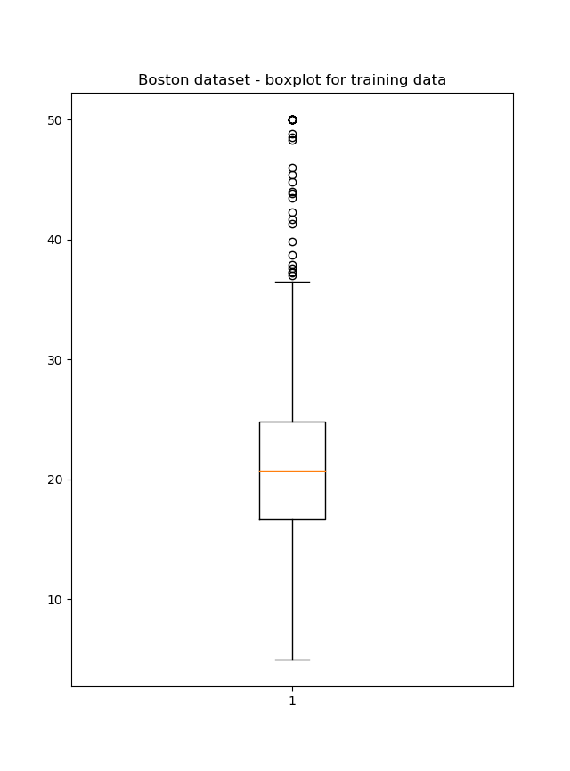 The sample, in our case, is the Boston housing dataset: it contains some mappings between feature variables and target prices, but obviously doesn't represent all homes in Boston, which would be the statistical population. Nevertheless, we can write some code to generate a box plot based on this dataset: