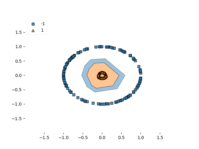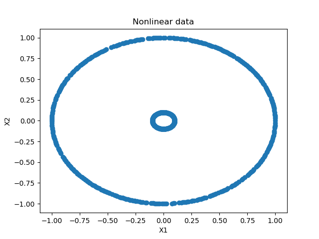 As you can see, we have generated two circles that are composed of individual data points: a large one and a smaller one. These are perfectly separable, although not linearly.
