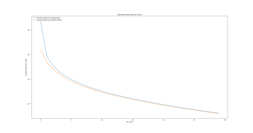 Obviously, we use hinge as our loss function. Using squared hinge loss is possible too by simply changing hinge into squared_hinge. That's up to you!