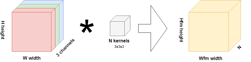 Once the data is input, it passes through N kernels (where N is an integer number, such as 3) or filters that have the same dimension. These kernels slide over the input data, performing element-wise multiplications, generating N feature maps of width Wfm and height Hfm, depending on the size of the kernel.