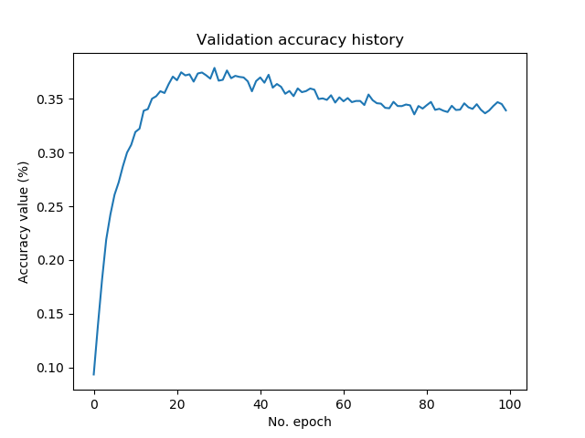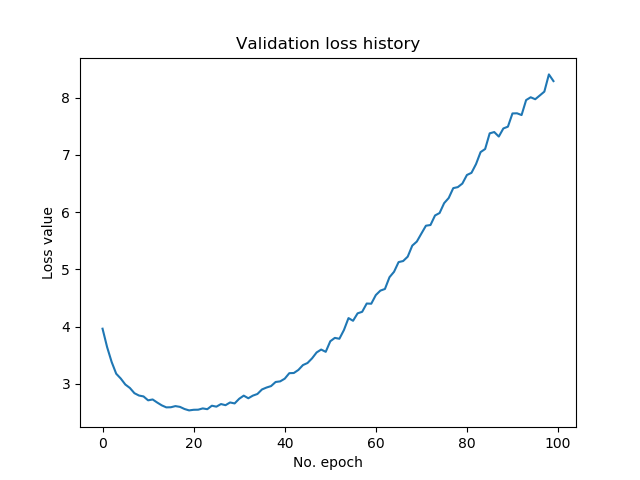 Neither is it strange that we observe overfitting again, by looking at the plot that displays validation loss. Our best model, with an accuracy of just above 35%, is achieved around epoch number 20. After then, performance deteriorates.