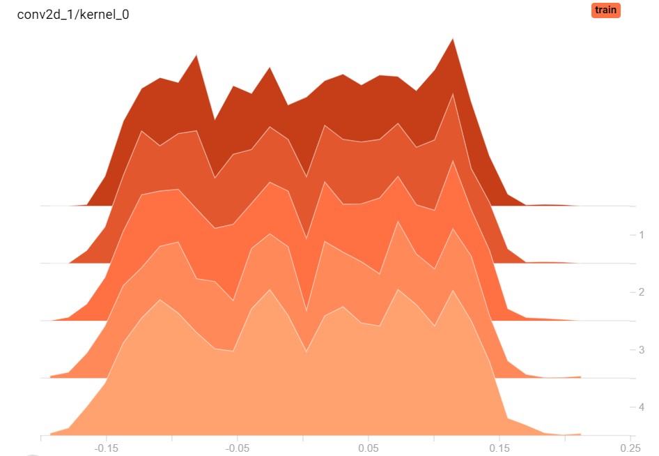 Weight histograms for one layer across 5 epochs; clearly, the weights change a bit.