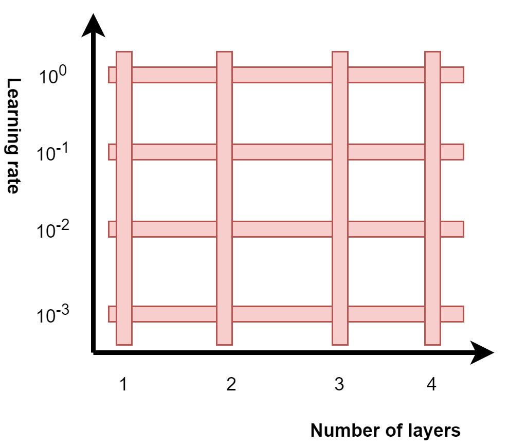 Here, all the intersections between the two axes (dimensions) are possible combinations of hyperparameters that can be selected for the model. For example, learning rate \(LR\) and number of layers \(N\) can be \((LR = 10^{-3}, N = 4)\), but also \((LR = 10^{-2}, N = 2)\) is possible, and so on. Here, we have two dimensions (which benefits visualization), but the more tunable options you add to your model, the more dimensions will be added to your search space.