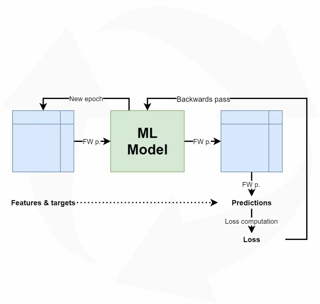 In terms of the machine learning process outlined above, we call feeding the training data to the model a forward pass. When data is passed forward, a prediction is computed for the input vector. In fact, this is done for all input vectors, generating as many predictions as there are training rows. Now that all the predictions are in, we can compare them with the ground truth - hence the supervision. In doing so, we can compute an average that represents the average error in the model, called a loss value. Using this loss value, we can subsequently compute the error contribution of individual neurons and subsequently perform optimization using gradient descent or modern optimizers.