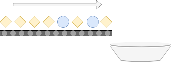 Suppose that you're working at an assembly line, where various parts are moving on a conveyor belt into the direction of a bucket. Schematically, this can be visualized as follows: