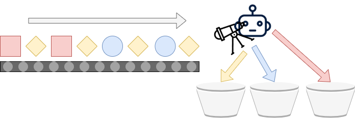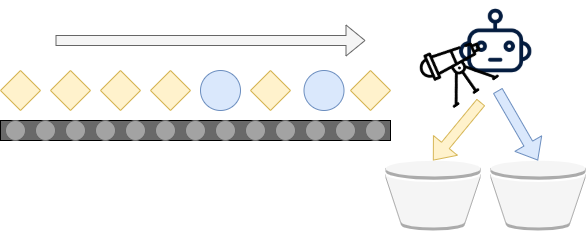 The second variant of classification is called multiclass classification. Here, we extend the assembly line by adding another bucket:
