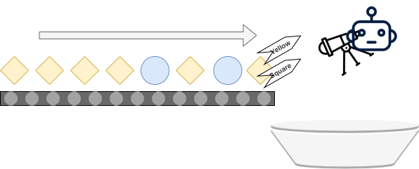 In the real world, this can be achieved by creating a Machine Learning model that takes a picture as input (essentially, a video feed is an endless stream of pictures) and subsequently predicts to what class the image belongs. Or, if we apply a model with more detail, detect the particular objects within the video. The ML powered system is thus a software program, a webcam as well as some 'actuator', or a mechanism that can act on predictions generated for some input. Thus, with Machine Learning, we can create the scenario above: using technology, we can separate the blue and yellow objects automatically.