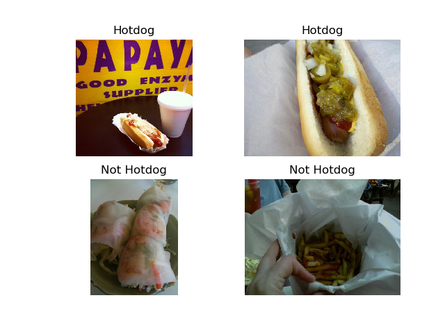 To give you an idea about the dataset: it's a few hundred pictures of hot dogs, and a few hundred pictures of foods that aren't hotdogs. Here are four samples: