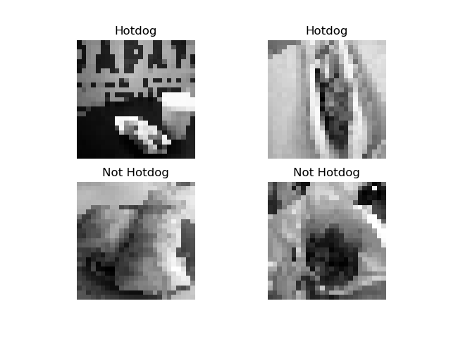 data_type and the class_name. By default, it attempts to load hot_dog images from the train folder.hotdog folder. That's why you had to rename the folder and move it to the folder where your Python script is located!imread, as a grayscale image - by means of the 0 specification. We don't want colors of images to interfere with the prediction, as it's all about shape. This is especially important in the case of small datasets, which can be biased. That's why we load the images as grayscale ones.instances, and the corresponding class number to the list of classes.instances and classes.After loading and preprocessing, our images should be both in grayscale and resized. Indeed, they now look as follows: