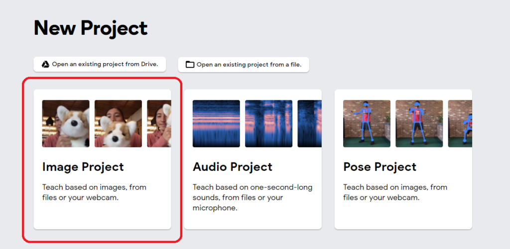 The web application then navigates to a page that lets you create your own project. We're going to create a classifier that is capable of classifying a webcam stream, so make sure to click 'Image Project'. Of course, if you're playing around yourself, you can also create an Audio Project or a Pose Project. Do note that training the model will take a bit longer with those kind of projects, because the input data is more complex.