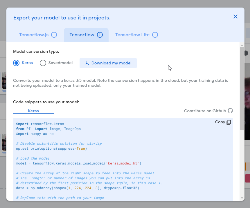 Even better is that you can export the model you just trained. For example, you can load it with TensorFlow, run it in the web browser with TensorFlow.js or use it with Model Optimization techniques in TensorFlow Lite. Simply click 'Export Model' and use the option you want - you'll even get a code example as part of the deal.