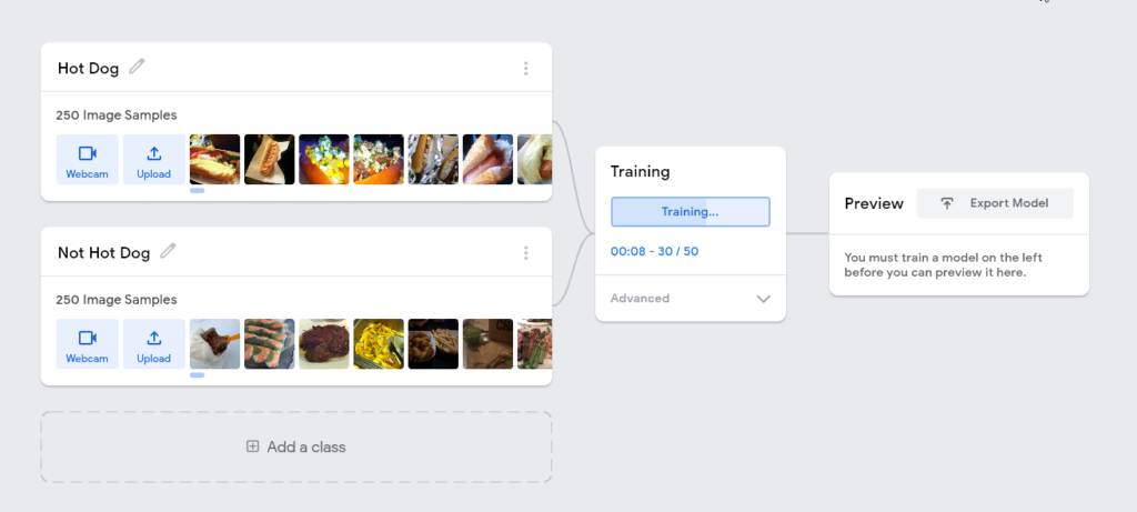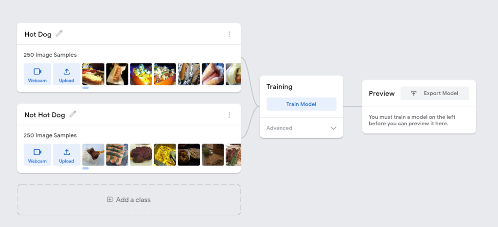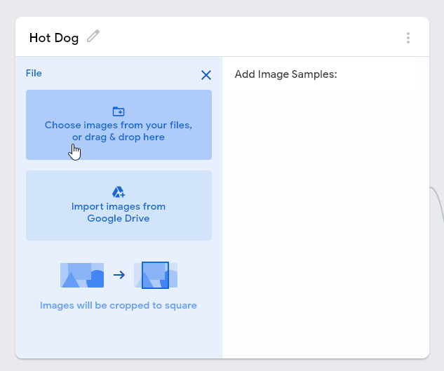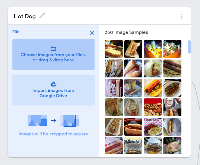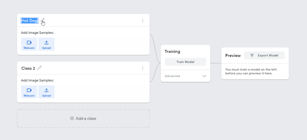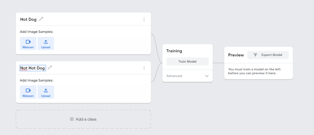 Let's now enter these classes. I'm going for the Hot Dog / No Hot Dog scenario, just like the Hotdog Classifier.