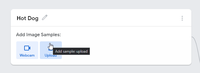 It's now time to generate training data. You can do so in multiple ways. If you have a dataset available (for example the Hot Dog / Not Hot Dog dataset), you can of course use that by clicking the 'Upload' button. You can also use your Webcam if you want to generate data yourself.