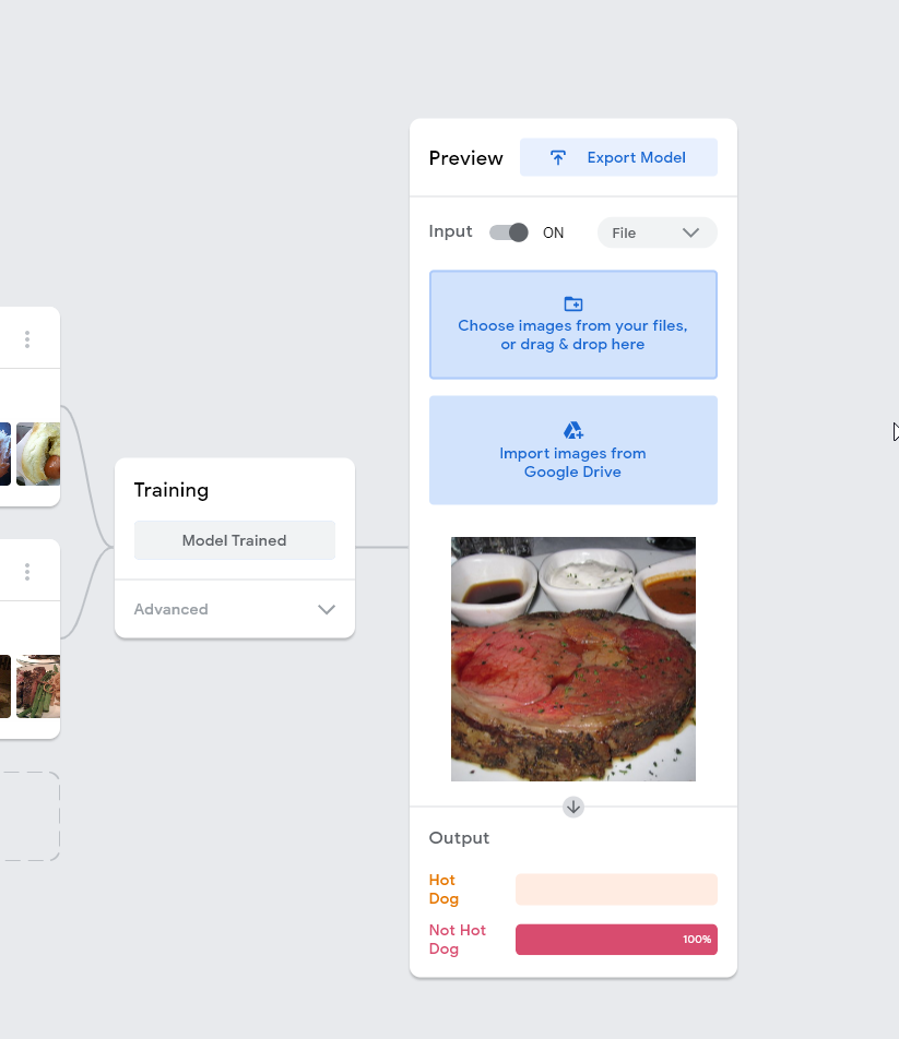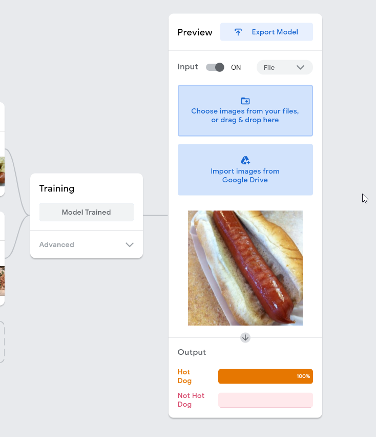 When it's done training, Preview Mode becomes available. Here, you can upload a few files - and see whether your model works.