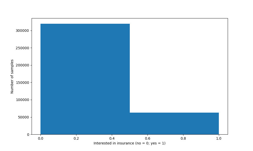 In total, more than 300.000 samples reflect people who have no interest in insurance. Close to 70.000 people do have interest in insurance. This means that for approximately every 0.35 people who want insurance, close to 1.7 want no insurance (approximately 5 want no insurance when 1 wants insurance).
