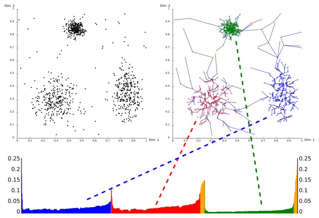 The 'ordered list' we just covered above is displayed in the image below, a so-called reachability plot. In this plot, the reachability distances for each point are mapped. Clearly, from one point, we can see how the clusters have been extended in a reachability distance-based ascending ordering: for the blue cluster, the distance ascends until it moves towards a red one; then towards a green one.