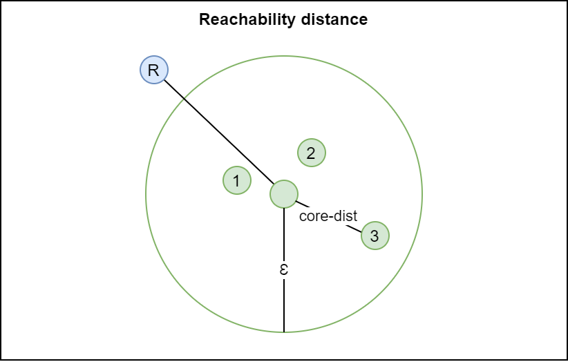 In the example below, the reachability distance from the core point to point 1 equals the core distance, because it is bigger. However, for a random point R, the reachability distance equals the distance to that point, because that one is bigger than the core distance.