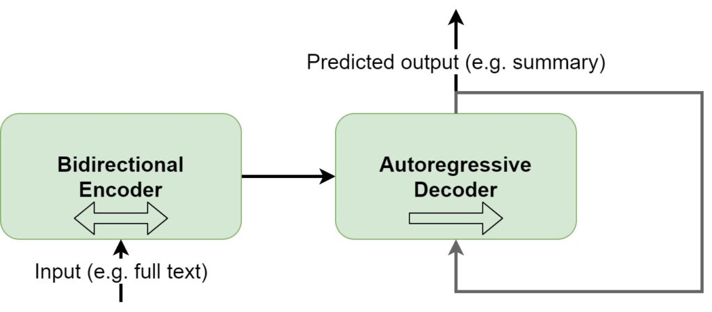 In the schema below, we visualize what BART looks like at a high level. First of all, you can see that input texts are passed through the bidirectional encoder, i.e. the BERT-like encoder. By consequence, texts are looked at from left-to-right and right-to-left, and the subsequent output is used in the autoregressive decoder, which predicts the output based on the encoder input and the output tokens predicted so far. In other words, with BART, we can now both understand the inputs really well and generate new outputs.