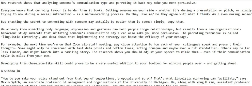 New research shows that analysing someone’s communication type and parroting it back may make you more persuasive . Linguistic mirroring is called ‘linguistic mirror’ and data shows that implementing the strategy can boost the efficacy of your message . For example, the next time you’re on that Zoom all-staff meeting, pay close attention to how each of your colleagues speak and present their thoughts . Some might only be concerned with fast data points and bottom lines, acting brusque and maybe even a bit standoffish . Others may be far less linear, and might launch into a rambling story . The research shows you should adjust your speech to mimic them – even if their communication style is miles from your own.