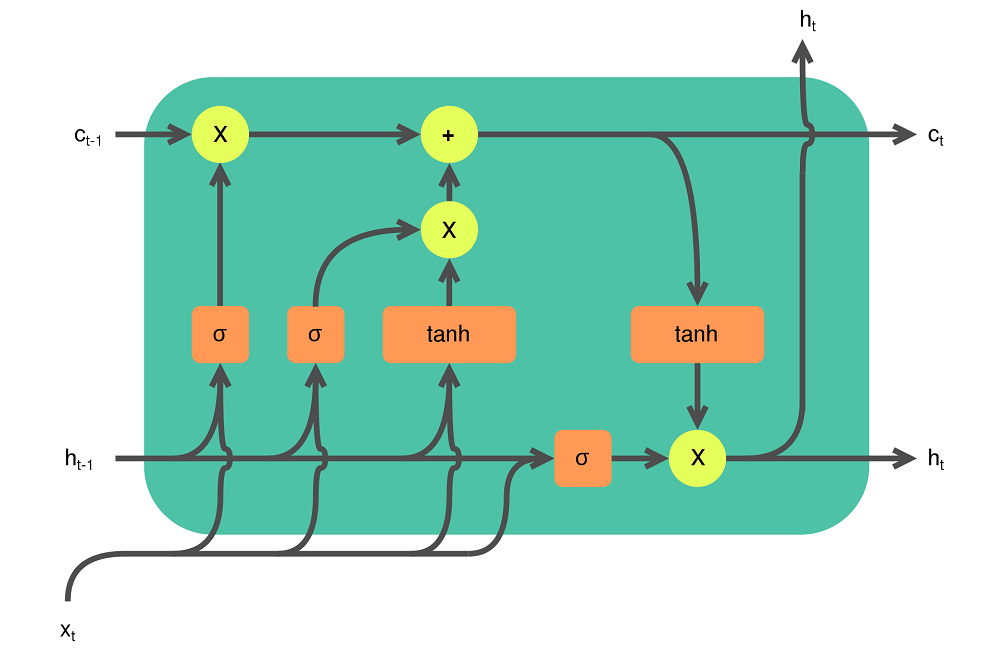 An LSTM cell. Created by Guillaume Chevalier (svg by Ketograff) at Wikipedia, licensed as CC BY 4.0.