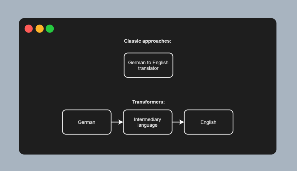 Transformers work differently because they use an encoder-decoder architecture. Think about it as if you're working with two translator. The first translator is capable of translating German into some intermediary, universal language. Another translator is capable of translating that language into English. However, at every translation task, you'll let translations pass through the intermediary language first. This will work as well as the classic approaches (in terms of whether the model yields any usable result). However, it is also scalable: we can use the intermediary language to train a model for summarizing text, for example. We don't need to train for the first translation task anymore.