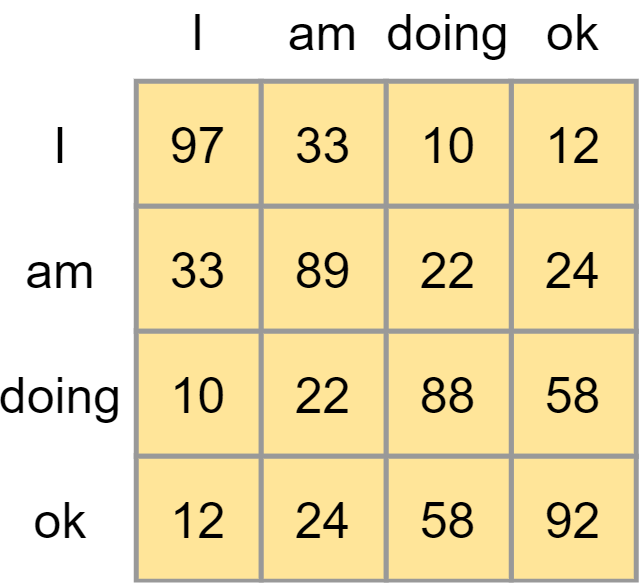 It illustrates the importance of certain words in a phrase given one word in a phrase in an absolute sense. However, they are not yet comparable. Traditionally, a Softmax function can be used to generate (pseudo-)probabilities and hence make the values comparable.