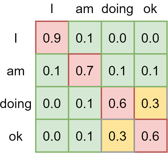 That's why a mask is applied to the scaled score matrix prior to generating pseudoprobabilities with Softmax. That is, if this is our score matrix...
