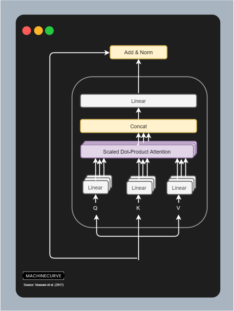 Each individual combination of building blocks is called an attention head. Since multiple attention heads are present in one encoder segment, this block is called a multi-head attention block. It performs scaled dot-product attention for every block, then concatenates all the outputs and lets it flow through a Linear layer, which once again produces a 512-dimensional output value.