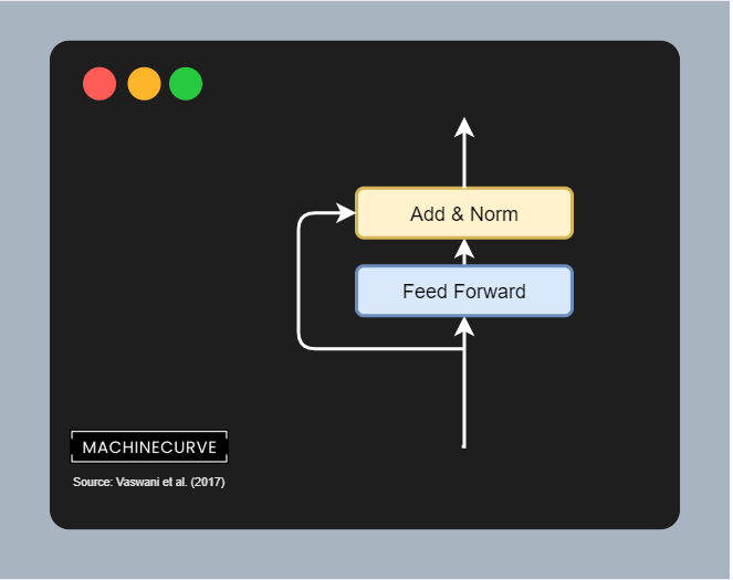 The output of the multi-head attention block is first added with the residual connection, which recall is the position-encoded input embedding for all the vectors. This is a simple addition operation. After adding, a layer normalization operation is performed on the outcome, before it is passed to the Feed-forward segment. Applying layer normalization stabilizes the training process, and adding the residual connection does the same.