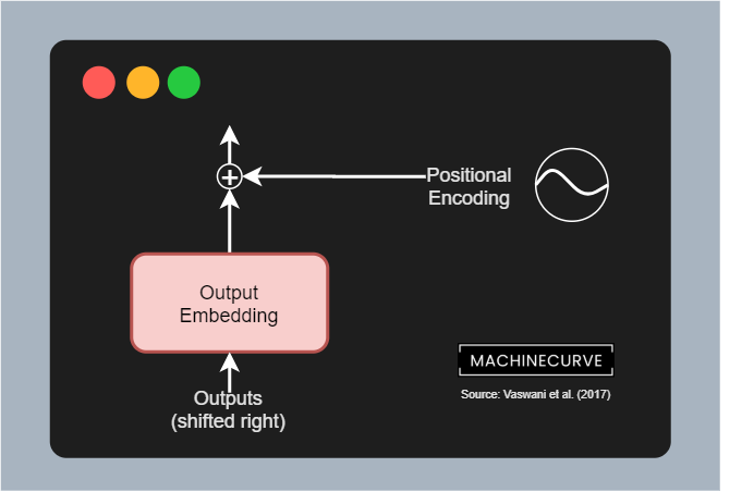 Like the encoder, the inputs to the decoder segment are also embedded first. Of course, this happens with the outputs, which are the target phrases from the sentence pairs with which vanilla Transformers are trained. Here, too, learned embeddings are used, and Vaswani et al. (2017) share the weight matrix of both embedding layers, and the pre-Softmax linear layer visualized above.