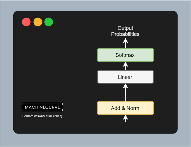 After the residual was added and the layer was normalized (visible in the figure as Add & Norm), we can start working towards the actual prediction of a token (i.e., a word). This is achieved by means of a linear layer and a Softmax activation function. In this linaer layer, which shares the weight matrix with the embedding layers, logits are generated - i.e. the importance of each token given the encoded inputs and the decoded outputs. With a Softmax function, we can generate output (pseudo)probabilities for all the tokens in our vocabulary.