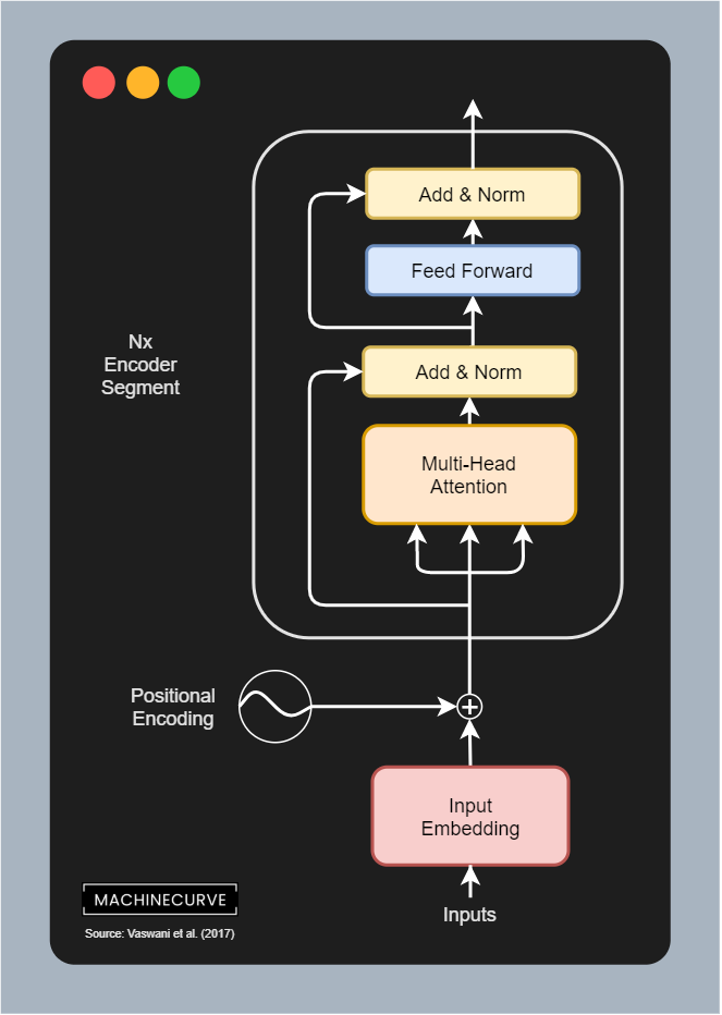 The encoder segment of a Transformer is responsible for converting inputs into some intermediary, high-dimensional representation. Visually, it looks as follows. The encoder segment is composed of a couple of individual components: