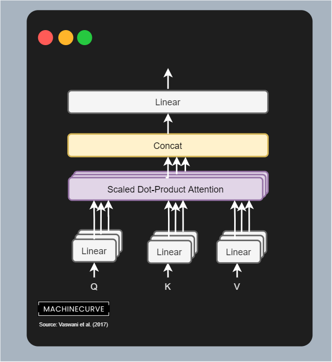 You can see that it has three inputs - queries (Q), keys (K) and values (V). This means that the position-encoded input vectors are first split into three separate streams and hence matrices; we shall see that this happens by means of 3 different Linear layers.