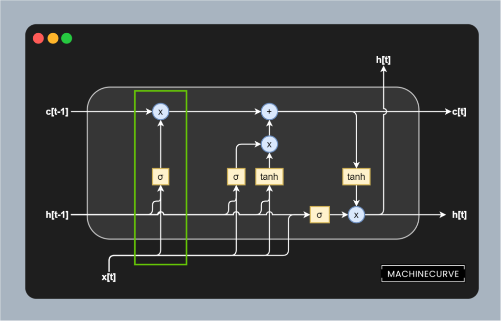The first way in which this will happen is through the forget gate, which has been selected in green below. The gate is composed of multiple components, from top to bottom: