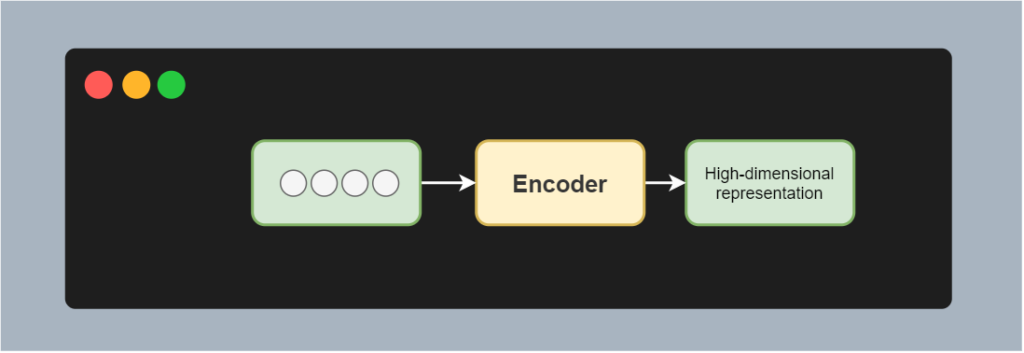 More visually, this looks as follows. Say that we've got an input sequence of four tokens, e.g. a tokenized version of the phrase "I am going home". When feeding this sequence to the encoder, it'll generate a high-dimensional representation. Through the training process, it has been trained to do so.