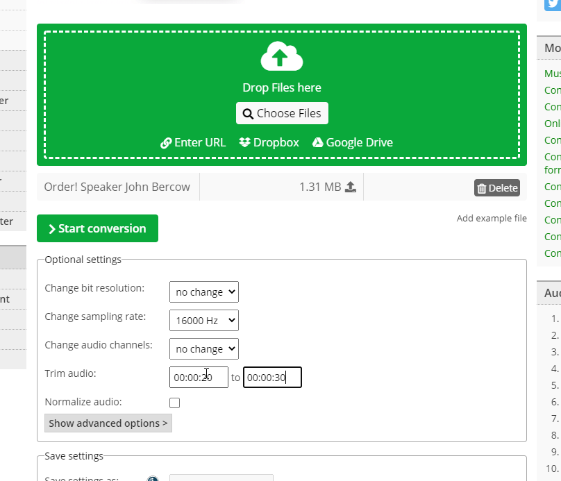 Any file that you want to use can be converted with online converters. You can use this converter to give just one example. Make sure to set 'change sampling rate' to 16000 Hz, as illustrated here: