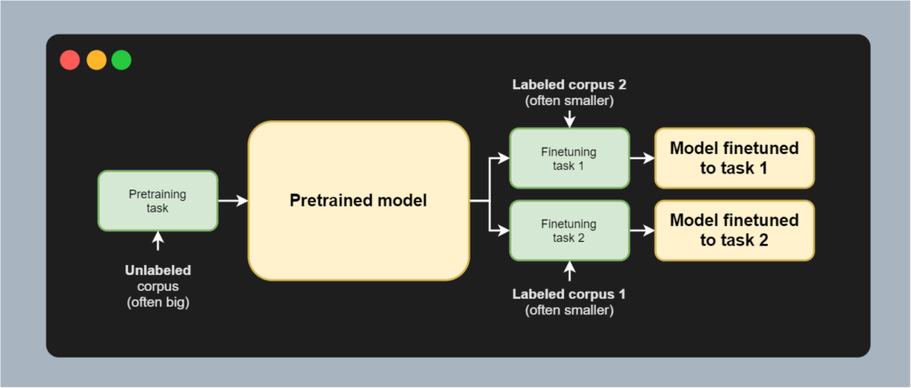Today, many language models - primarily Transformers models, which we will discuss in more detail below - are trained on a language task. There is a variety of language tasks. Language modeling is one of them. The goal with language modeling is that given a current set of input tokens, a new token is predicted. This token should obviously be the token that corresponds to the actual next token in the input data. This way, language models can learn to recognize patterns in text.