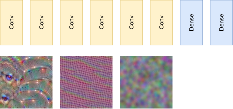 When stacking multiple convolutional layers, the feature maps learned in each subsequent layer become more high level. For example, in the image below, we see a ConvNet with multiple Conv layers and two Dense layers for eventual prediction. When visualizing the filters/kernels of these ConvNets, low-level concepts (such as eyes) are still visible within images. The more downstream one gets, the more generic these patterns get.