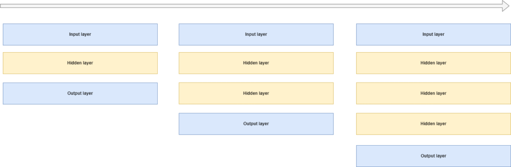 It works really simply. You start with a simple neural network - an input layer, a hidden layer, and an output layer. You train it for a fixed number of epochs - say, 25. Then, after training, you freeze all the layers, except for the last one. In addition, you cut it off the network. At the tail of your cutoff network, you now add a new layer - for example, a densely-connected one. You then re-add the trained final layer, and you end up with a network that is one layer deeper. In addition, because all layers except for the last two are frozen, your progress so far will help you to train the final two better.