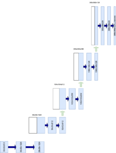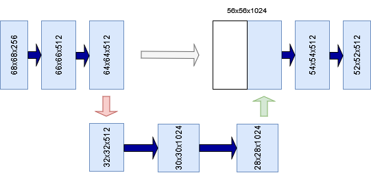Between each convolutional block, a max pooling operation is performed. It uses a 2x2 pool size and a stride 2 for downsampling. This means that the input image is cut in half width and height wise. This is compensated with a doubling in feature map size. Since the number of feature maps at the start is 64, we end up with a 5-time double, thus 1024 feature maps at the bottom of the U.