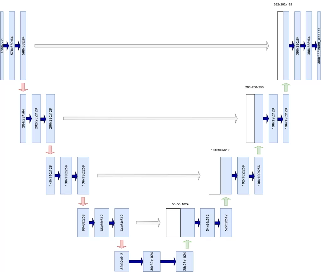 Note that in contemporary variations of U-Net, the output is always of equal size to the input in the width and height dimensions (e.g., 32x32x3 --> 32x32xC). In the original U-Net, however, this was not the case!